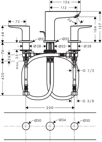Дизайн на 3 отверстия: Отдельные ручки для горячей и холодной воды обеспечивают удобство управления и придают элегантный внешний вид.