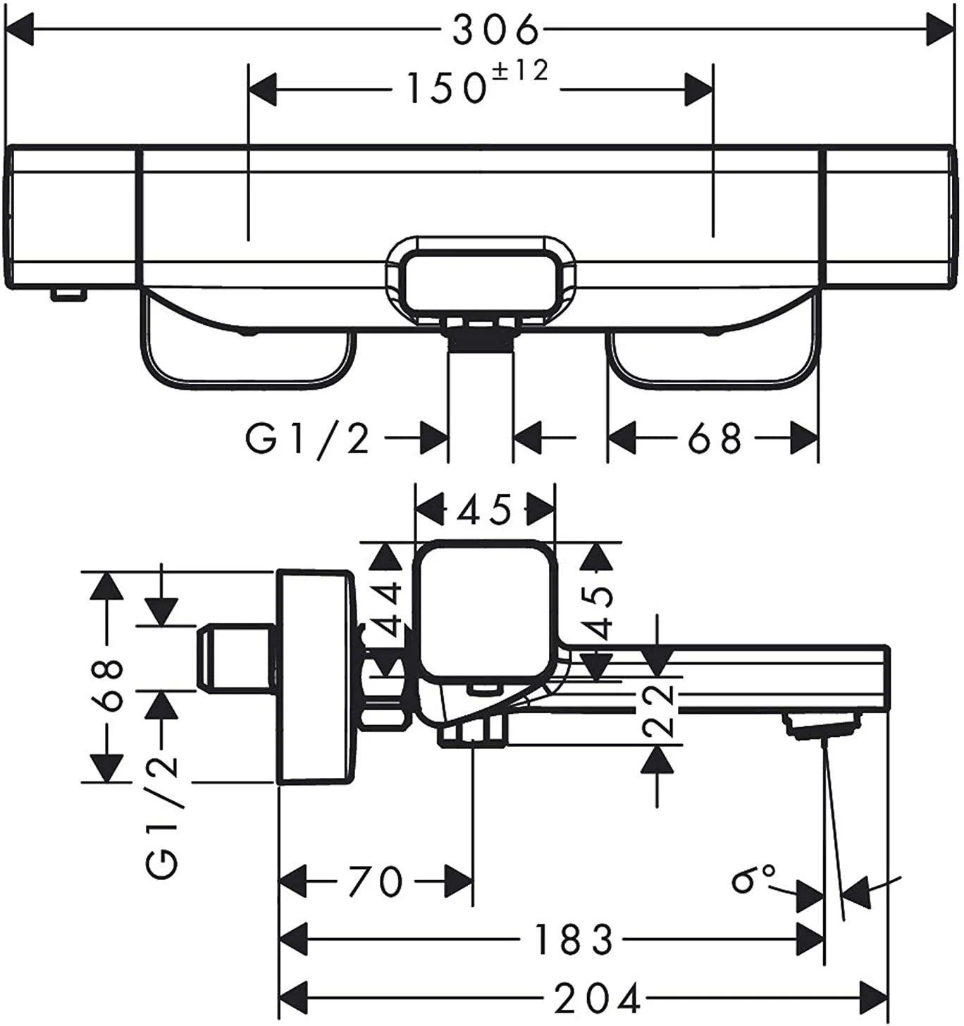 Этот смеситель оснащен двумя потребителями, что позволяет использовать его для управления как ванной, так и душем. Его межосевое подключение составляет 150 ± 12 мм, обеспечивая удобную установку и совместимость с различными ванными и душевыми системами.
