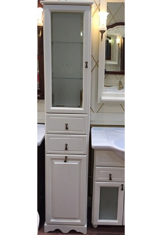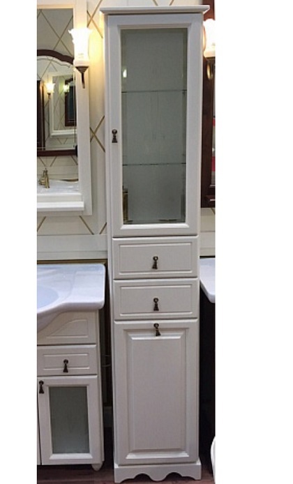 Дополнительно в коллекцию входит напольный пенал, также выполненный в двух версиях: с матовым стеклом (верхняя дверца пенала) для отделок Нагал и Белая, нижний фасад предлагается с декоративной решеткой и бельевой корзиной и с художественным стеклом (верхняя дверца пенала) для отделки Слоновая кость, нижняя дверца пенала также с бельевой корзиной.