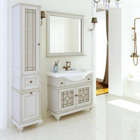 Коллекция БЕАТРИЧЕ создана для настоящих ценителей классического стиля. При изготовлении мебели используется массив натурального дерева, патинированный под бронзу. Итальянская лицевая фурнитура придает коллекции неповторимый шарм. Два небольших ящика под керамической раковиной и две створки на петлях с интегрированным доводом делают тумбу максимально функциональной. Большое удобное зеркало в обрамлении рамы строгой классической формы с изящной полочкой зрительно расширит пространство в ванной комнате. Дополняет коллекцию шкаф-колонна с большим вместительным ящиком и фасадом-створкой в верхней части, за которым установлены полки. В нижней части шкафа расположена вместительная бельевая корзина.